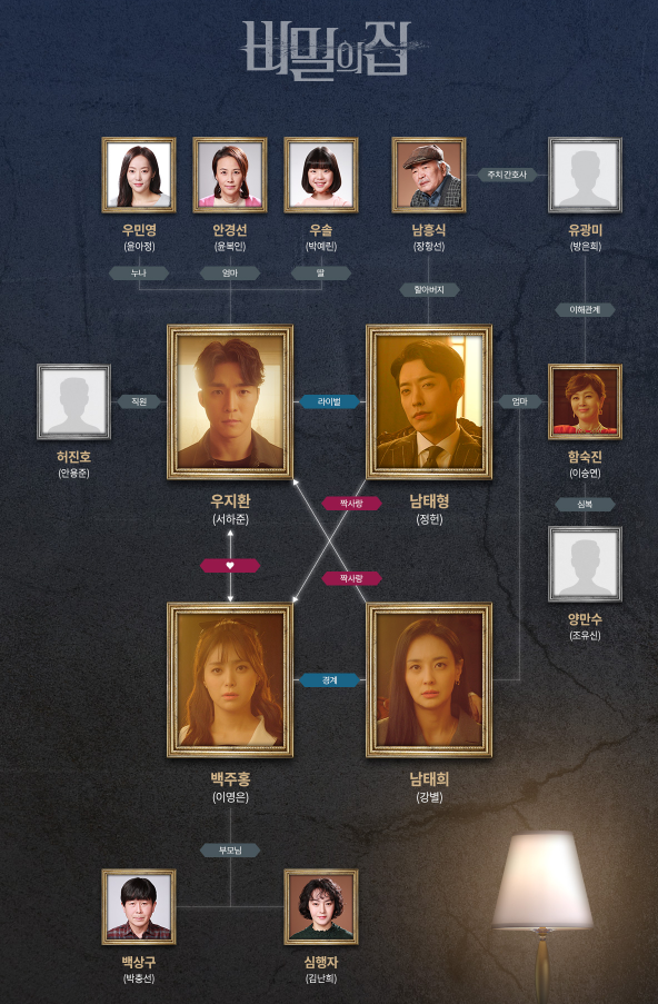 비밀의 집은 서하준(우지환 역), 이영은(백주홍 역), 정헌(남태형 역), 강별(남태희 역), 이승연, 장항선, 방은희, 윤아정, 안용준 등이 출연합니다.