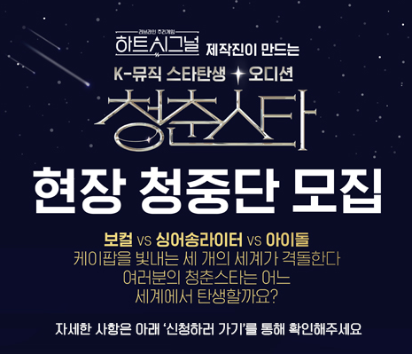 채널 A 현장 <청춘스타> 현장 청중단 모집이 4.2(토)까지 모집중이니 청춘스타 탄생을 지켜보는 행운도 가져가시기 바랍니다.
