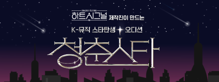 K뮤직 스타탄생 오디션 청춘스타! 하트시그널 제작진이 만드는 청춘스타는 국적 성별 장르 불문하고 지원이 가능합니다. 보컬, 싱어송라이터, 아이돌까지 지원가능한 K뮤직 스타탄생 오디션 청춘스타는 4월에 방영됩니다.